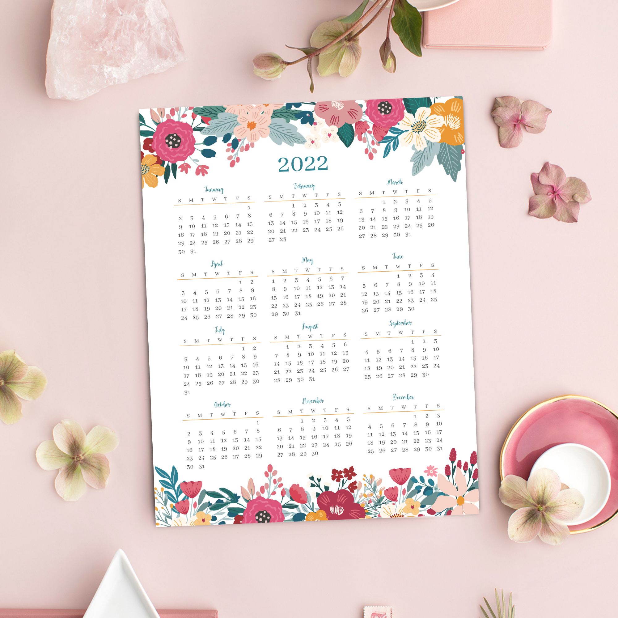 Floral 2022 Year-at-a-Glance Calendar